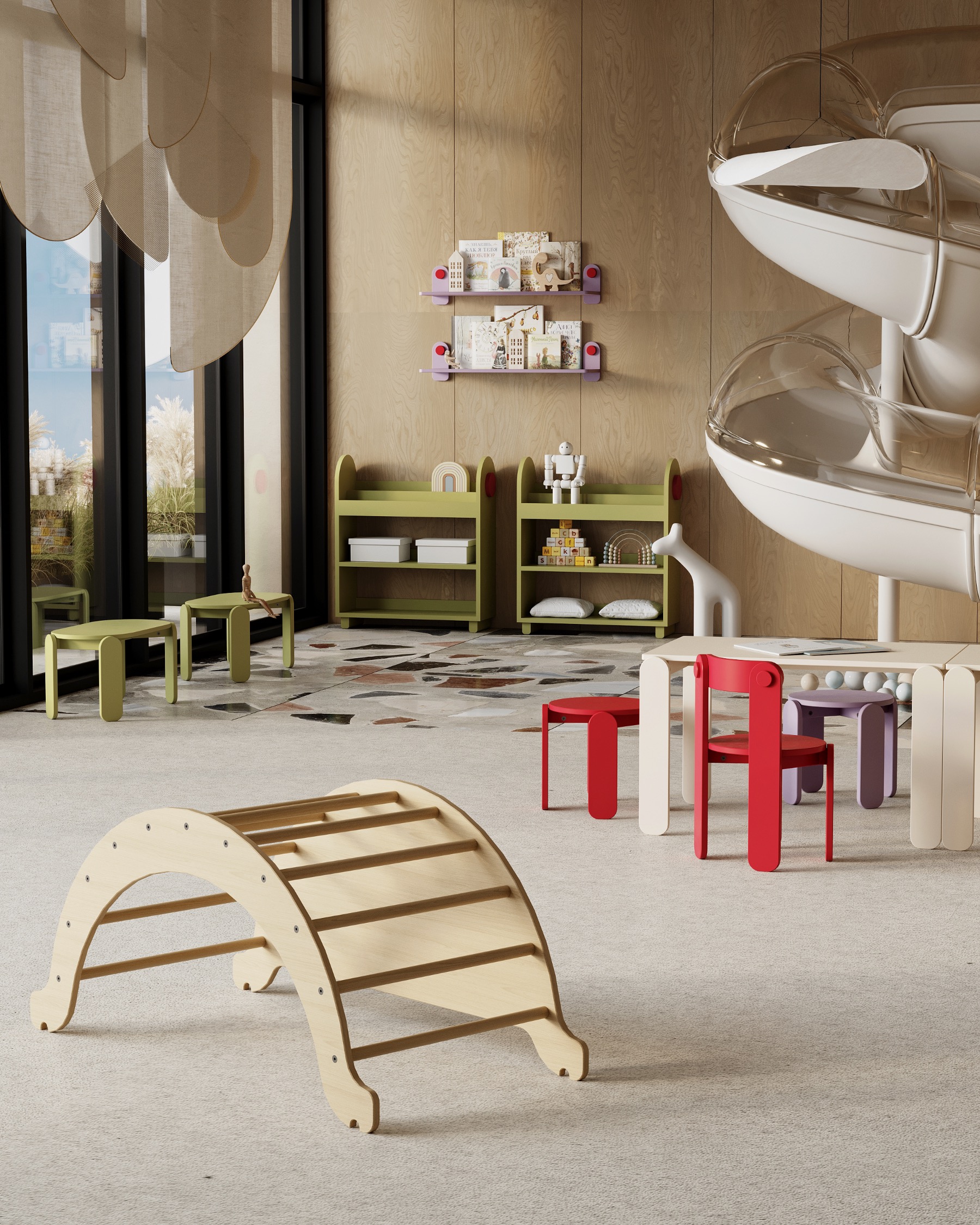 Sa posebnim delom za knjige i stripove, i dovoljno prostora za omiljene igračke, ova polica pomaže deci da organizuju svoj svet na jednostavan i lep način. Njene meke linije i stabilna izrada savršeno se uklapaju u svaki dečiji kutak.